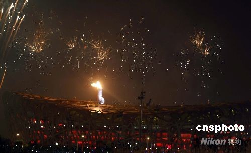 8月8日,第29屆夏季奧運(yùn)會(huì)在北京奧林匹克公園內(nèi)的國(guó)家體育場(chǎng)“鳥巢”舉行。李寧點(diǎn)燃北京奧運(yùn)會(huì)主火炬,奧運(yùn)圣火在鳥巢上空熊熊燃燒。中新社發(fā) 盛佳鵬 攝