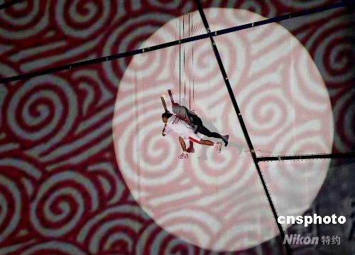 8月8日,第29屆夏季奧運(yùn)會(huì)在北京奧林匹克公園內(nèi)的國(guó)家體育場(chǎng)“鳥巢”舉行。中國(guó)“體操王子”李寧飛繞“鳥巢”一周后點(diǎn)燃主火炬。 中新社發(fā) 任晨鳴 攝