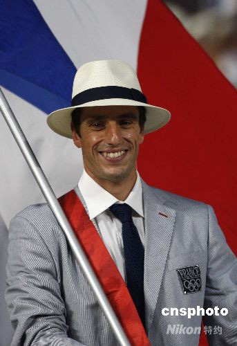 圖為法國(guó)奧運(yùn)代表團(tuán)的旗手、兩屆奧運(yùn)皮劃艇激流回旋項(xiàng)目的金牌得主托尼·埃斯蓋當(dāng)。中新社發(fā) 杜洋 攝