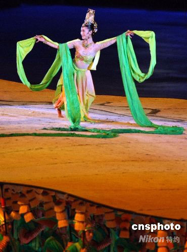 第二十九屆夏季奧運(yùn)會(huì)8月8日晚在北京奧林匹克公園內(nèi)的國(guó)家體育場(chǎng)舉行開幕式,藝術(shù)家在美麗“畫卷 ”上表演的“絲路”舞蹈。 中新社發(fā) 任晨鳴 攝