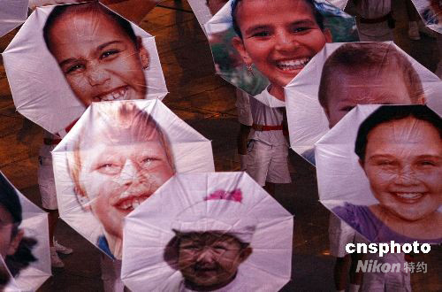 第二十九屆夏季奧運(yùn)會(huì)8月8日晚在北京奧林匹克公園內(nèi)的國(guó)家體育場(chǎng)舉行開幕式,從世界各地征集的2008個(gè)兒童的笑臉向八方賓客歡笑。 中新社發(fā) 任晨鳴 攝