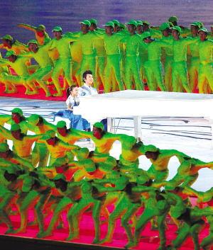 演出下篇開(kāi)始,只見(jiàn)郎朗坐在一片藍(lán)色的海洋中,身邊坐著一個(gè)天真稚氣的小女孩兒,圍繞在他周圍的是無(wú)數(shù)穿著高科技發(fā)光服的“綠”人,郎朗面帶微笑,一臉輕松和愉悅,音符從十指間滑出,周圍的場(chǎng)景隨之不斷發(fā)生著奇妙變化,藍(lán)色的海洋開(kāi)始呈現(xiàn)出中國(guó)現(xiàn)代化建設(shè)成就,青藏鐵路也出現(xiàn)在郎朗的腳下。而“綠”人身上的光也隨之變化為銀色,變換出和平鴿、銀河等造型,最后濃縮為一座微型的鳥(niǎo)巢,郎朗在“巢中巢”歡快地彈奏,一個(gè)小女孩飛進(jìn)巢中巢,乘著風(fēng)箏飛到他面前,充滿詩(shī)意。整個(gè)節(jié)目長(zhǎng)達(dá)8分鐘,成為本屆開(kāi)幕式上分量最重的個(gè)人演出。在演出結(jié)束的第一時(shí)間,通過(guò)萬(wàn)寶龍公司的幫助,本報(bào)對(duì)郎朗進(jìn)行了專訪。