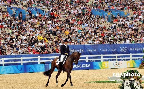 八月九日,北京奧運馬術(shù)項目首日在香港沙田賽場舉行盛裝舞步賽事。此項比賽旨在考驗馬匹的服從性、靈活性,騎手與馬匹須合作演出一連串精心設(shè)計的優(yōu)雅舞步動作,因此,馬術(shù)盛裝舞步賽被稱為“馬術(shù)芭蕾”。 中新社發(fā) 鄧慶樂 攝
