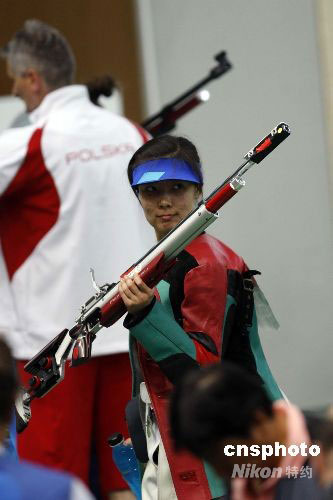 8月9日,北京奧運會開賽的第一天,女子10米氣步槍決賽在北京射擊館進行。中國選手杜麗無緣金牌,捷克選手卡特日娜·埃蒙斯獲得首枚金牌,同時也是北京奧運會產(chǎn)生的首枚金牌。中新社發(fā) 盛佳鵬 攝