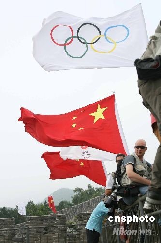 圖為奧運(yùn)旗幟在長(zhǎng)城上高高飄揚(yáng)。中新社發(fā) 武仲林 攝
