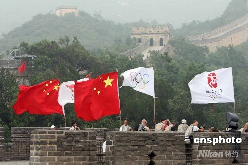圖為奧運(yùn)旗幟在長城上高高飄揚(yáng)。中新社發(fā) 武仲林 攝