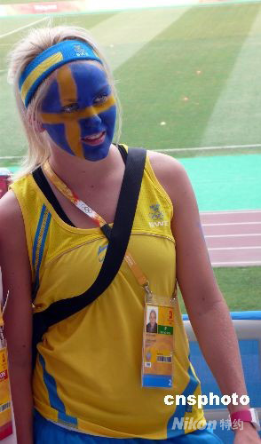 8月9日,首戰(zhàn)失利的瑞典女足在天津將迎來第二個對手阿根廷隊。比賽前,“全副武裝”的瑞典女球迷早早來到球場為球隊加油。中新社發(fā) 鄧霞 攝