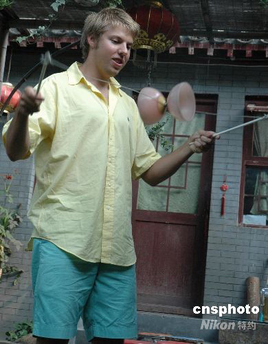 奧運(yùn)會(huì)期間,北京將迎來四十五萬(wàn)中外游客。圖為8月9日下午一美國(guó)青少年游覽北京金絲胡同的一座四合院時(shí),學(xué)主人玩起了抖空竹游戲。 中新社發(fā) 王辛莉 攝