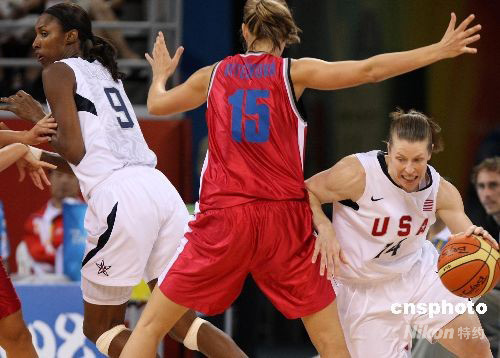 8月9日晚,雅典奧運會冠軍美國女籃在北京奧運會籃球館——五棵松體育館開始衛(wèi)冕之旅,首場比賽以97比57擊敗捷克隊。圖為美國隊超級球星9號萊斯麗,利用檔拆戰(zhàn)術協(xié)助14號后衛(wèi)史密斯突破捷克隊防線。 中新社發(fā) 任晨鳴 攝