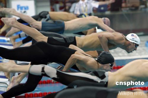 8月9日,北京奧運(yùn)會游泳大戰(zhàn)在國家游泳中心“水立方”揭開序幕。美國游泳名將菲爾普斯在當(dāng)日進(jìn)行的男子400米混合泳預(yù)賽中以4分07秒82的成績打破奧運(yùn)會紀(jì)錄,輕松入圍! ≈行律绨l(fā) 杜洋 攝