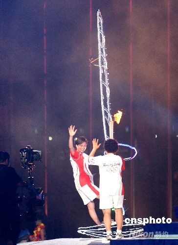 第29屆奧林匹運(yùn)動(dòng)會帆船比賽啟動(dòng)儀式8月9日晚在青島舉行,曾經(jīng)獲得1992年巴塞羅那奧運(yùn)帆板女子A390級亞軍的張小冬手持火炬與香港退役運(yùn)動(dòng)員李麗珊交接火炬。中新社發(fā) 趙振清 攝