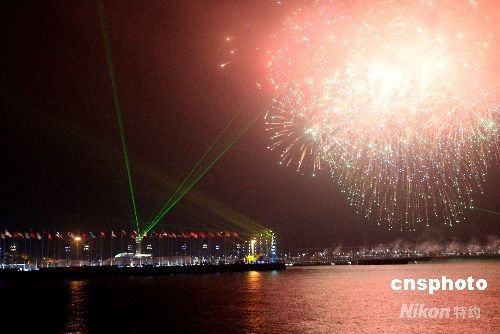第29屆奧林匹運(yùn)動(dòng)會(huì)帆船比賽啟動(dòng)儀式8月9日晚在青島舉行,絢麗多彩的煙花映亮奧帆中心。中新社發(fā) 趙振清 攝