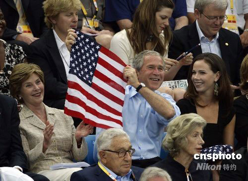 8月10日,美國(guó)總統(tǒng)布什、澳大利亞總理陸克文(右上)在“水立方”觀看北京奧運(yùn)會(huì)游泳比賽,為“自家”選手加油。中新社發(fā) 杜洋 攝