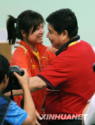 中國選手郭文珺(左)與中國射擊隊(duì)總教練王義夫擁抱,慶祝勝利。新華社記者 李尕?cái)z(來源:新華網(wǎng))