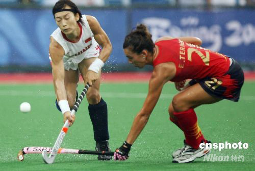 8月10日,中國女曲在北京奧運(yùn)會女子曲棍球小組賽首場比賽中以3:0戰(zhàn)勝西班牙隊。圖為雙方球員展開激烈爭奪。中新社發(fā) 武仲林 攝