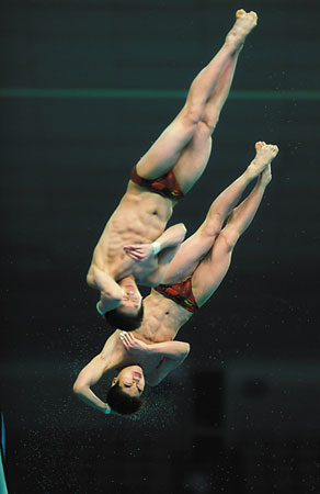 在2007年贏得世錦賽冠軍時(shí),林躍/火亮組合的4個(gè)自選動(dòng)作難度系數(shù)總和為13.3,當(dāng)時(shí)總分為489.48分。其中,裁判在比賽過程中共出示了18個(gè)10分滿分,可見兩人實(shí)力之強(qiáng)大。在今年2月“好運(yùn)北京”第16屆跳水世界杯賽上,兩人再次折桂。不同的是,這次他們將原本壓軸的307C調(diào)整到倒數(shù)第二跳,將壓軸跳留給了難度系數(shù)高達(dá)3.8的5255B。這樣一來,難度只有3.3的207C被取代,兩人的難度系數(shù)總和也上升到13.8,在世界跳壇尚難有其他組合能夠比肩。