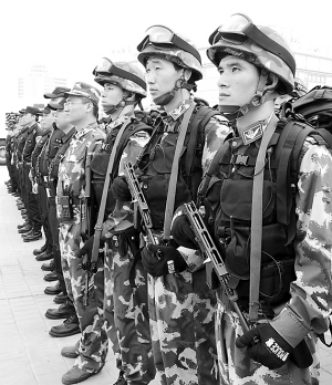 圖為公安特警武警準(zhǔn)備在街頭武裝巡邏。 本報(bào)記者 張 震 攝