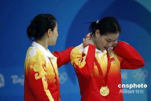 8月10日,素有“夢之隊(duì)”之稱的中國跳水隊(duì)黃金組合郭晶晶和吳敏霞輕松獲得女子雙人三米板金牌。圖為郭晶晶在領(lǐng)獎(jiǎng)臺(tái)上幫吳敏霞整理衣領(lǐng)。中新社發(fā) 杜洋 攝