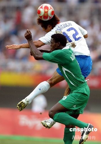 8月10日下午,在奧運(yùn)男足小組賽天津賽區(qū),日本男足0:2不敵尼日利亞隊。圖為日本隊12號谷口博之在爭頂。中新社發(fā) 陳文 攝