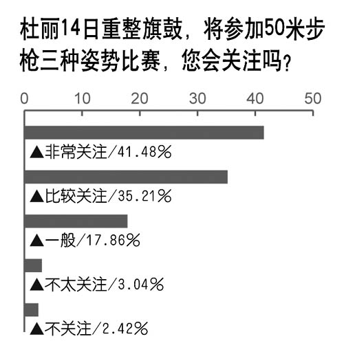 昨天的民調(diào)顯示,公眾和成龍一樣,仍然喜歡杜麗。14日,杜麗將重整旗鼓,出戰(zhàn)女子50米步槍三種姿勢射擊賽。調(diào)查發(fā)現(xiàn),分別有41.5%和35.2%的公眾表示對此非常關(guān)注和比較關(guān)注,不關(guān)注的公眾僅占5.4%。 (記者李濤)