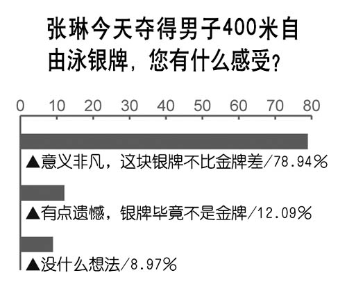 同時,公眾高度評價張琳奪得男子400米自由泳銀牌。78.9%的人認為這塊銀牌“意義非凡,不比金牌差”。只有12.1%的人表示“有點遺憾,銀牌畢竟不是金牌”,另有9.0%的人表示“沒什么想法”。