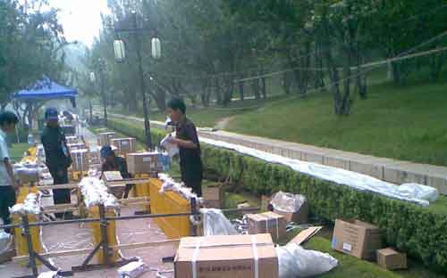 8月8號(hào),早6時(shí)30分,負(fù)責(zé)安裝煙花的工人來到了現(xiàn)場(chǎng),開始對(duì)煙花進(jìn)行安裝調(diào)試。在安裝調(diào)試的過程中,出現(xiàn)了一個(gè)問題,由于現(xiàn)場(chǎng)有很多樹,部分樹枝可能會(huì)阻擋煙花發(fā)現(xiàn)的路徑,導(dǎo)致煙花不能正常發(fā)射,甚至造成火災(zāi)。為了防止這種事故的發(fā)生,消防官兵對(duì)發(fā)射炮一一的做了檢查,認(rèn)真計(jì)算其發(fā)現(xiàn)的軌道,盡量避免在發(fā)射軌道中出現(xiàn)樹枝等阻擋物。如果遇到實(shí)在不能避免的樹枝,即迅速與當(dāng)?shù)叵嚓P(guān)人員聯(lián)系,給與解決。通過大家的統(tǒng)統(tǒng)努力,所有的煙花在8月8號(hào)上午11點(diǎn)50分完成了安裝調(diào)試。到這時(shí),消防官兵已經(jīng)連續(xù)工作了15個(gè)小時(shí),但是消防官兵知道現(xiàn)在還不能休息,只有到煙花綻放在空中那一刻,才能真正地放下心來。