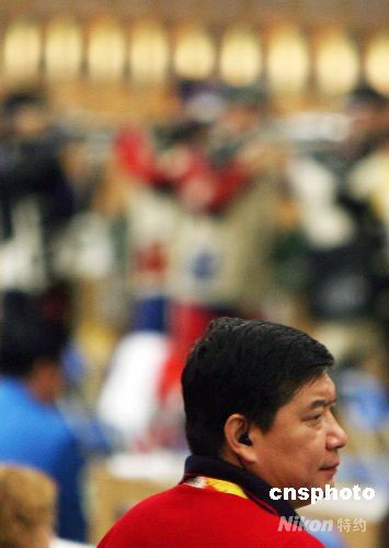 8月11日上午,中國選手朱啟南、曹逸飛爭奪北京奧運(yùn)會(huì)男子10米氣步槍決賽權(quán)。中國射擊隊(duì)總教練王義夫現(xiàn)場觀戰(zhàn)。 中新社發(fā) 武仲林 攝
