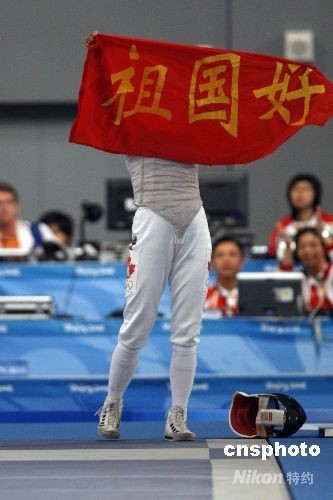 圖:欒菊杰北京擊劍場上高舉“祖國好”