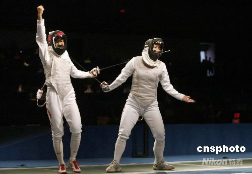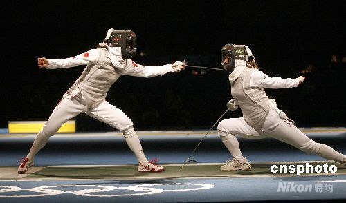 8月11日,北京奧運(yùn)會女子花劍個人1/16決賽在北京國際會議中心擊劍館舉行,中國選手蘇婉文(左)以15:7戰(zhàn)勝美國選手埃米莉·克羅斯,成功晉級。 中新社發(fā) 盛佳鵬 攝