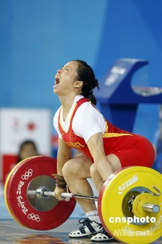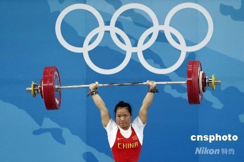 8月11日,北京奧運會女子舉重58公斤級決賽在北京航空航天大學(xué)體育館進(jìn)行,2004年雅典奧運會冠軍、中國選手陳艷青衛(wèi)冕成功,再次奪取這個級別的金牌。中新社發(fā) 盛佳鵬 攝