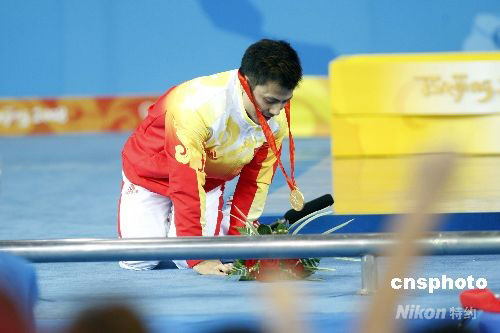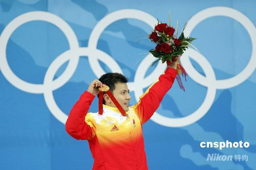 8月11日,北京奧運會開賽以來的第三天,男子舉重62公斤級的決賽在北京航空航天大學體育館結束,中國選手張湘祥摘得金牌。中新社發(fā) 盛佳鵬 攝