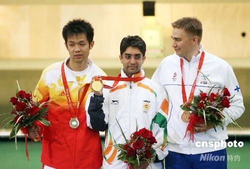 8月11日,印度選手賓德拉以700.5環(huán)奪得北京奧運會男子10米氣步槍金牌。這也是印度獲得的第一枚奧運會個人項目金牌。中新社發(fā) 武仲林 攝