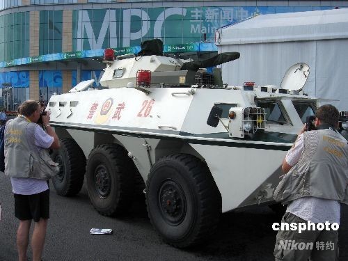 8月12日,一輛停在北京奧運(yùn)會主新聞中心的前的武裝巡邏車引起了許多媒體的注意。中新社發(fā) 杜洋 攝
