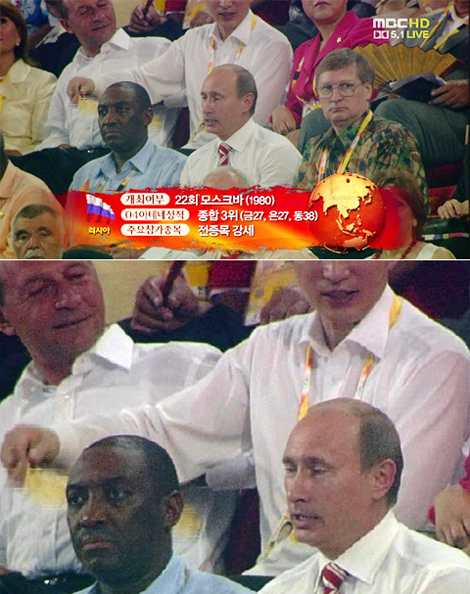 據(jù)韓國《朝鮮日報》報道,這一視頻被上傳到美國YouTube網(wǎng)站,是對8日北京奧運會開幕式現(xiàn)場直播的畫面進(jìn)行編輯的。當(dāng)俄羅斯代表團(tuán)入場時,鏡頭對準(zhǔn)了坐在俄羅斯貴賓席上的俄羅斯總理普京,就在這時,坐在普京身后的李明博也被拍個正著。