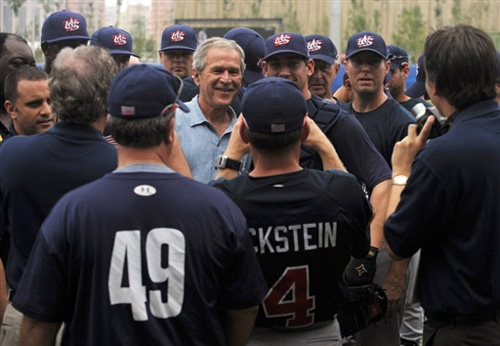 布什與美國棒球隊運(yùn)動員交談并合影留念。