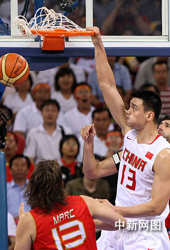 8月12日,北京奧運(yùn)會男子籃球小組賽第二輪賽事開賽,首戰(zhàn)負(fù)于“夢八隊(duì)”的中國男籃在姚明率領(lǐng)下向世錦賽冠軍西班牙隊(duì)發(fā)起猛攻。圖為姚明大力扣籃。中新社記者 任晨鳴 攝