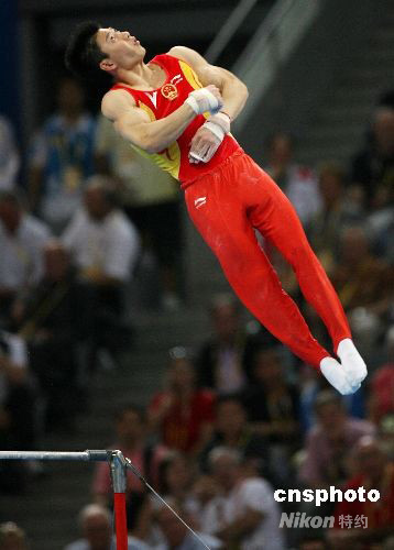 8月12日,中國(guó)隊(duì)在北京奧運(yùn)會(huì)體操男子團(tuán)體比賽中以286.125 分勇奪金牌。圖為李小鵬在單杠比賽中。 中新社發(fā) 武仲林 攝