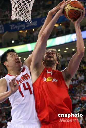北京奧運會男子籃球小組賽第二輪賽事8月12日打響,首戰(zhàn)負(fù)于“夢八隊”的中國男籃在姚明率領(lǐng)下向世錦賽冠軍西班牙隊發(fā)起猛攻,上半場結(jié)束,中國以46比37領(lǐng)先。圖為王郅治封蓋加索爾的扣籃。中新社發(fā) 任晨鳴 攝