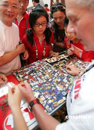 8月12日,眾多“國際級”紀(jì)念章收藏者在北京奧林匹克博覽會上擺攤兒,與前來歡享北京奧運(yùn)會的世界各地體育迷交換體育紀(jì)念章。象征著友誼的紀(jì)念章在奧林匹克的節(jié)日里——只換,不賣。中新社發(fā) 楊可佳 攝