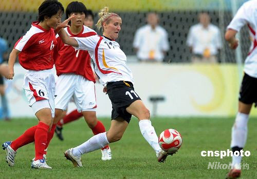 8月12日下午,奧運(yùn)女足小組賽進(jìn)行到第三輪,朝鮮女足和德國(guó)隊(duì)的較量在天津“水滴”體育場(chǎng)進(jìn)行,德國(guó)隊(duì)以1:0勝朝鮮隊(duì)。中新社發(fā) 陳文 攝
