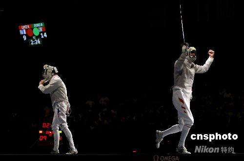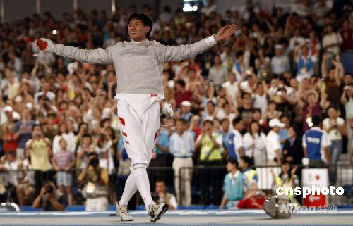 8月12日晚,08北京奧運(yùn)會(huì)男子佩劍個(gè)人賽決賽在北京國際會(huì)議中心擊劍館揭開戰(zhàn)幕,賽會(huì)黑馬14號種子中國選手仲滿和法國選手洛佩茲在決賽中遭遇,結(jié)果中國選手仲滿以15-9戰(zhàn)勝對手獲得冠軍,這是中國男子擊劍在奧運(yùn)會(huì)上第一次獲得冠軍。 中新社發(fā) 盛佳鵬 攝