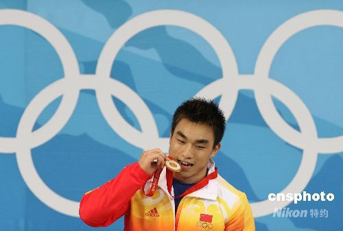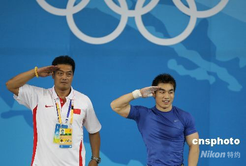 8月12日,中國(guó)選手廖輝在北京奧運(yùn)會(huì)男子舉重69公斤級(jí)比賽中以348公斤的總成績(jī)奪得冠軍。在賽后進(jìn)行的頒獎(jiǎng)儀式上,獲得冠軍的中國(guó)小將廖輝一出場(chǎng)就博得了現(xiàn)場(chǎng)觀眾的陣陣掌聲,最終站上領(lǐng)獎(jiǎng)臺(tái)的八一小將也再次以一個(gè)軍禮回敬了主場(chǎng)觀眾的支持。 中新社發(fā) 武仲林 攝