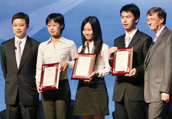比爾蓋茨與學(xué)生合影。(圖片來(lái)源:文匯報(bào))