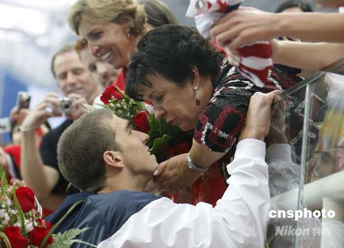 8月13日,美國游泳傳奇人物菲爾普斯,在北京奧運會男子4乘200米自由泳接力中奪得自己奧運會的第11枚金牌后,擁抱并親吻在“水立方”看臺上觀戰(zhàn)的媽媽黛比(Debbie)。 中新社發(fā) 杜洋 攝