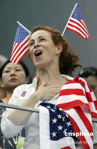 8月13日,一名美國(guó)觀眾和美國(guó)游泳隊(duì)一起高唱國(guó)歌慶祝勝利。當(dāng)日,美國(guó)隊(duì)在北京奧運(yùn)會(huì)男子4x200米自由泳接力項(xiàng)目上,奪得金牌并刷新世界紀(jì)錄,美國(guó)運(yùn)動(dòng)員在“水立方”屢獲佳績(jī),也成為美國(guó)觀眾最幸福的地方。中新社發(fā) 杜洋 攝