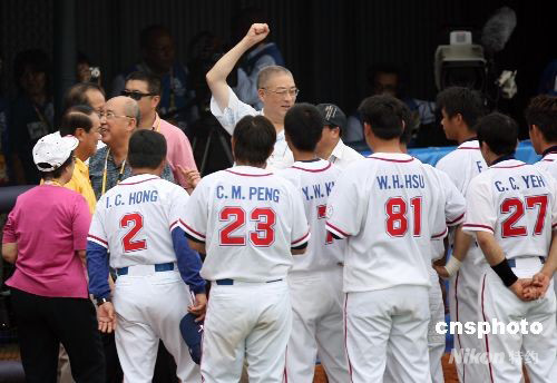 8月13日,中華臺(tái)北棒球隊(duì)在北京奧運(yùn)會(huì)棒球首場(chǎng)比賽中以5:0戰(zhàn)勝荷蘭隊(duì)。中國(guó)國(guó)民黨主席吳伯雄、親民黨主席宋楚瑜、國(guó)民黨秘書(shū)長(zhǎng)吳敦義等,賽后慰問(wèn)球員。 中新社發(fā) 武仲林 攝