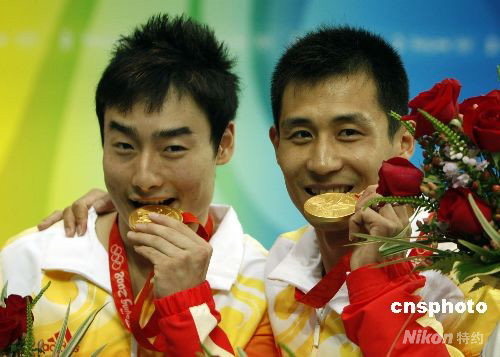 8月13日下午,北京奧運(yùn)會(huì)男子雙人三米板決賽在國(guó)家游泳中心進(jìn)行,最終中國(guó)選手王峰/秦凱以總分469.08分將這枚金牌收入囊中。這是中國(guó)跳水“夢(mèng)之隊(duì)”在北京奧運(yùn)會(huì)上獲得的第4枚金牌,也是中國(guó)代表團(tuán)在本屆奧運(yùn)會(huì)上獲得的第16金。俄羅斯“跳水沙皇”薩烏丁和搭檔庫納科夫以總分421.98分獲得亞軍,銅牌被烏克蘭選手克瓦沙/普雷格羅夫摘得,成績(jī)是415.05分。圖為獲獎(jiǎng)后的王峰、秦凱在笑品冠軍滋味。 中新社發(fā) 杜洋 攝