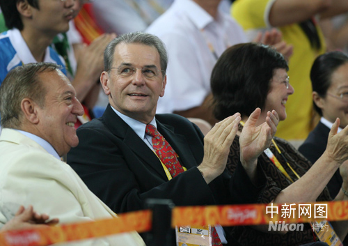 國際奧委會(huì)主席羅格在場下為打破世界紀(jì)錄的劉春紅精彩的表現(xiàn)鼓掌。中新社記者 武仲林 攝