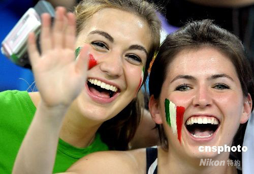 8月13日晚,北京奧運男足澳大利亞隊對陣科特迪瓦隊。圖為澳大利亞美女球迷在天津為球隊助威。 中新社發(fā) 陳文 攝