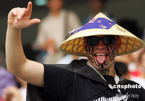 8月13日,北京奧運(yùn)會(huì)男足小組賽,新西蘭VS比利時(shí)的比賽在上海體育場(chǎng)進(jìn)行。熱情的新西蘭球迷成為了賽場(chǎng)邊一道艷麗的風(fēng)景,奧足賽場(chǎng)也成為了新西蘭球迷展示個(gè)性的最佳場(chǎng)所。 中新社發(fā) 湯彥俊 攝